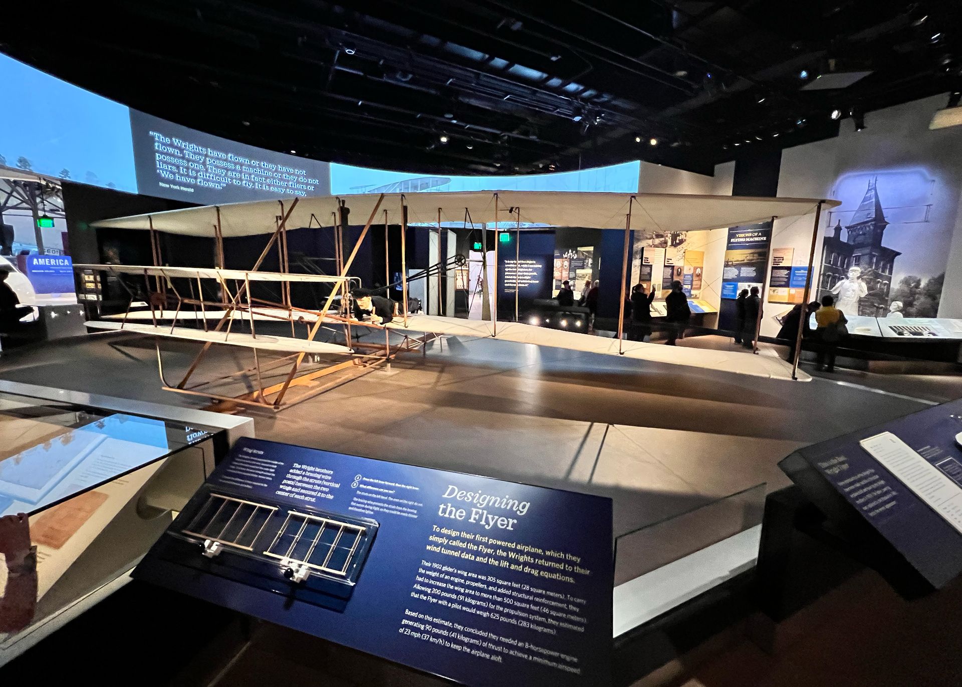 A photo from the Smithsonian's National Air and Space Museum of the Wright Flyer, taken in Jan 2023